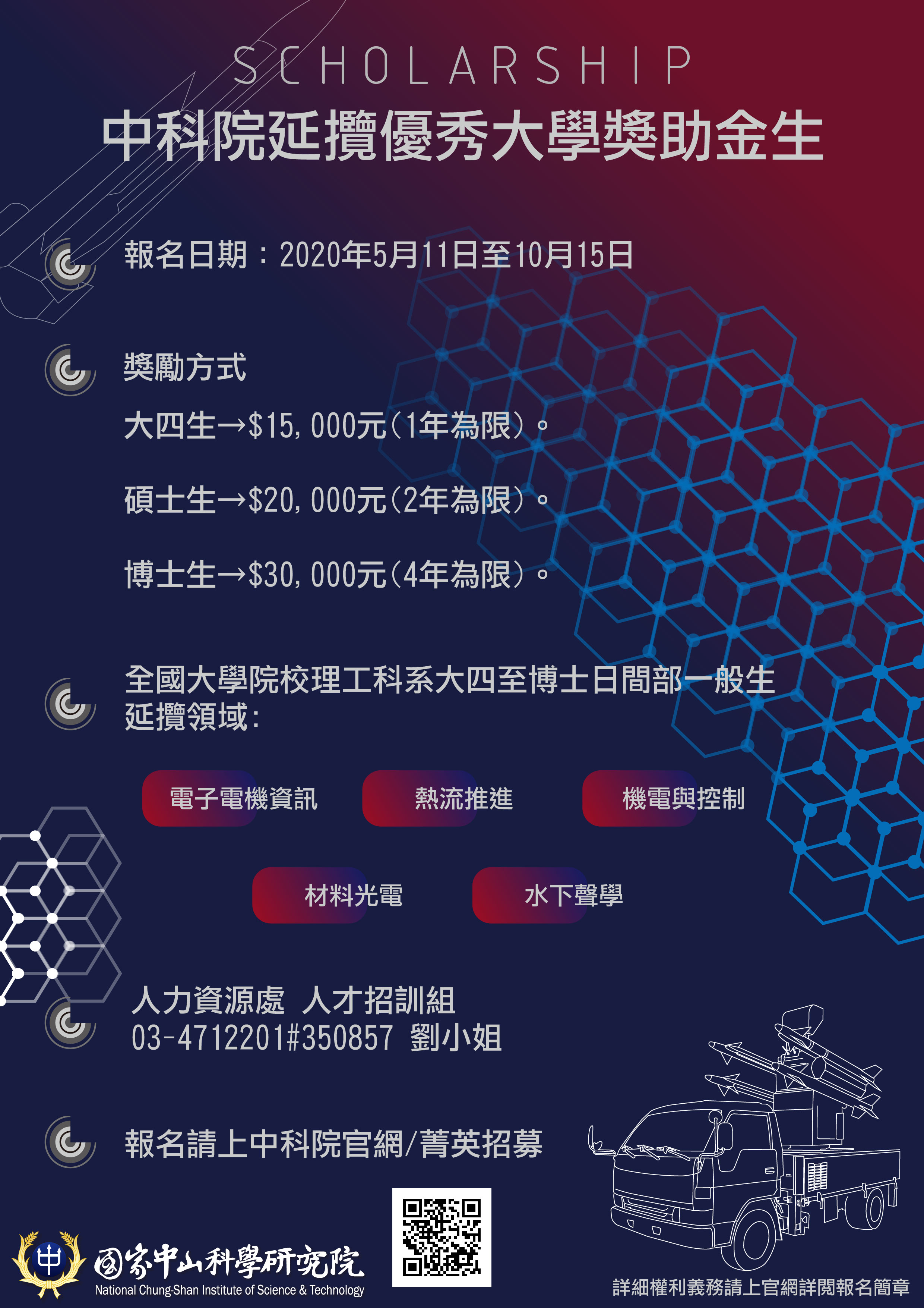 | 獎學金名稱 | 109年『國家中山科學研究院延攬大學院校優秀學生獎助金甄選』(限定理、工、電資學院) |